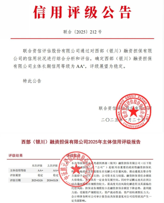 AA+評(píng)級(jí)是西部擔(dān)保發(fā)展中的重要里程碑,更是對(duì)未來發(fā)展的鞭策。西部擔(dān)保將以此為契機(jī),積極落實(shí)黨中央、自治區(qū)、銀川市及金投集團(tuán)的工作部署,持續(xù)強(qiáng)化“風(fēng)險(xiǎn)防控”生命線,深化科技賦能,創(chuàng)新普惠金融產(chǎn)品體系,重點(diǎn)聚焦“六新六特六優(yōu)+N”產(chǎn)業(yè)發(fā)展,聚力銀川市“三新”產(chǎn)業(yè)和“兩都五基地”建設(shè)目標(biāo),通過差異化擔(dān)保服務(wù)破解中小微企業(yè)融資難題,為區(qū)域經(jīng)濟(jì)高質(zhì)量發(fā)展貢獻(xiàn)擔(dān)保力量。